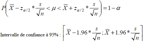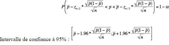 On en déduit l’intervalle, de confiance approximativement égale à ‘1-a’ suivant