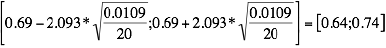 Exemple: Un collectionneur de papillons a prélevé 20 cocons d’une variété de papillons et les a pesés. Il obtient, sur cet échantillon de 20 cocons, un poids moyen de 0.69g et une variance (corrigée) de 0.0109 Pour construire un intervalle de confiance 0.95, il faut chercher dans la table le quantile d’ordre 0.975 d’une loi de Student à 19=20 1 degré de liberté. On trouve =2.093 (à noter que ce coefficient est plus grand que la valeur 1.96 utilisée pour les grands échantillons) et donc l’intervalle de confiance 95%:
