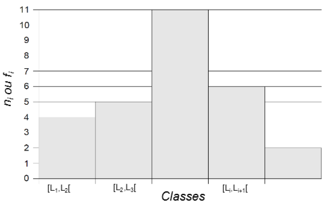 Nous pouvons représenter le tableau statistique par un histogramme. Nous reportons les classes sur l’axe des abscisses et, au-dessus de chacune d’elles, nous traçons un rectangle dont l’aire est proportionnelle à la fréquence fi (ou l’effectif ni) associée. Ce graphique est appelé l’histogramme des fréquences.
