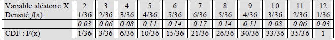 Jet de 2 dés et X = somme des nb affichés par les 2 dés