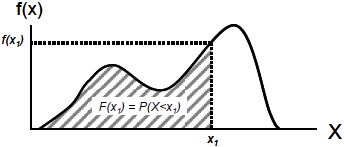 Dans tous les cas; la fonction de densité, notée f(x) correspond à la courbe (ou à la ligne brisée dans les cas simples, mais rarement rencontrés). La fonction de répartition, notée F(x) correspond à une aire située entre cette courbe et l’axe des abscisses.
